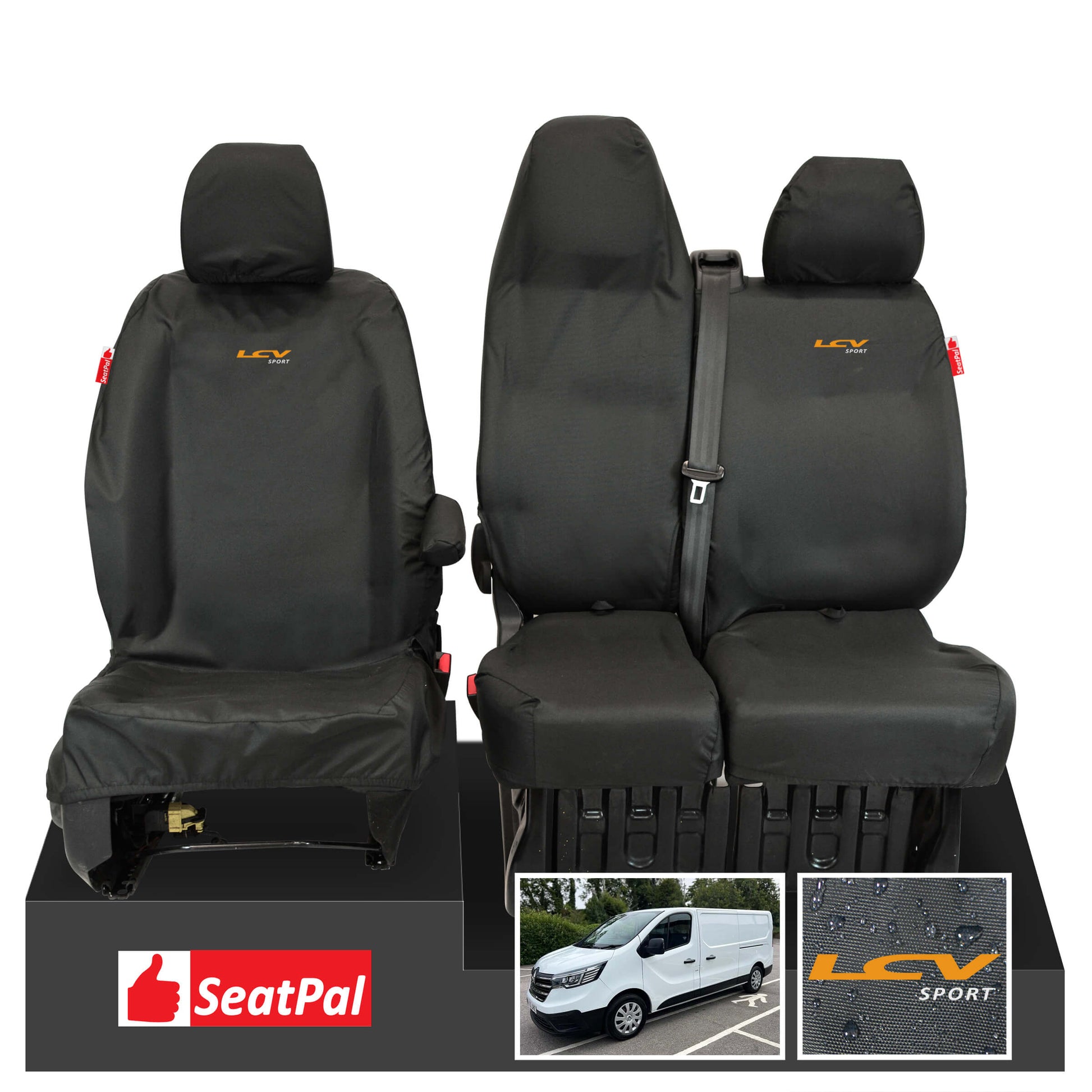 SeatPal-The Professionals Choice Renault Trafic MY14 Onwards Front Set Black Tailored Waterproof Seat Covers LCV Sport Benefits & Features Single Driver & Double Passenger Waterproof Seat Cover Set, Includes 2 x Separate Headrest Covers & 1x Integrated Headrest Cover & 1x Driver's Armrest & Logos Fully Tailored Manufactured In Our Exclusive Tearbrake Material Tested In Harsh Environments Giving You Years Of Service Thoughtfully Engineered To Allow Access To: Under Seat Storage, Side Armrests, Centre Armrests, Headrests, Seat Belts & Seat Functionality Mechanisms Airbag Compliant (where applicable) Seams Stitched In Parachute Thread |